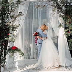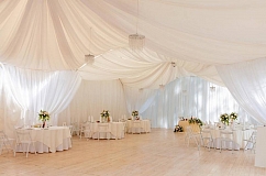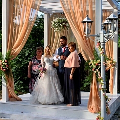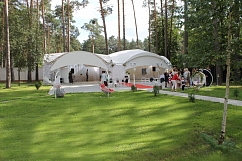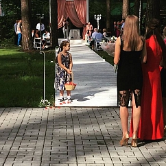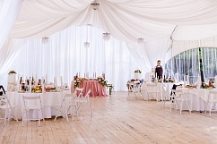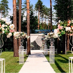 Резиденция, площадью 1 га находится недалеко от Гомеля, в живописном месте, в лесу, в окружении вековых сосен. Белоснежные драпированные шатры более 200 кв. м. разместят до 150 гостей, площадка может похвастаться несколькими живописными локациями, где может быть организован приветственный коктейль, лаунж зона для отдыха гостей, церемония разрезания торта и множество других свадебных действ.